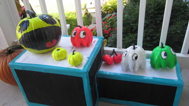 Pac Man, fantasmas, pellets y cerezas. El Pac Man y los fantasmas son tallados de calabazas de torta de azúcar. El Pac Man fue tallado en él lado así que pude mantener que la forma redonda. Los pellets son sólo pequeñas calabaza calabazas dio vuelta