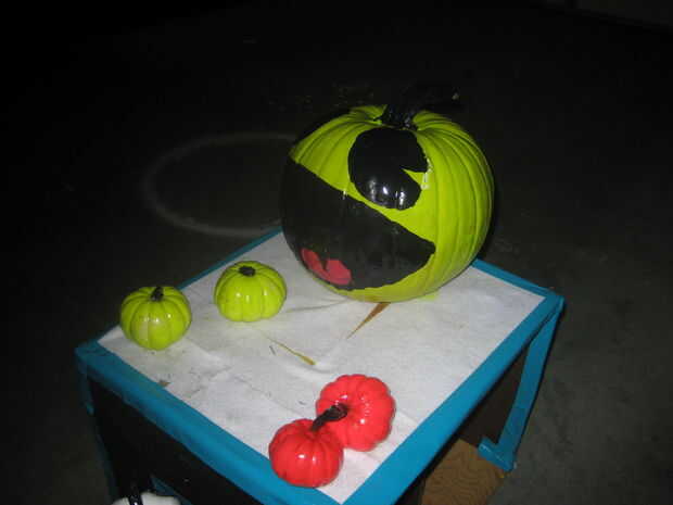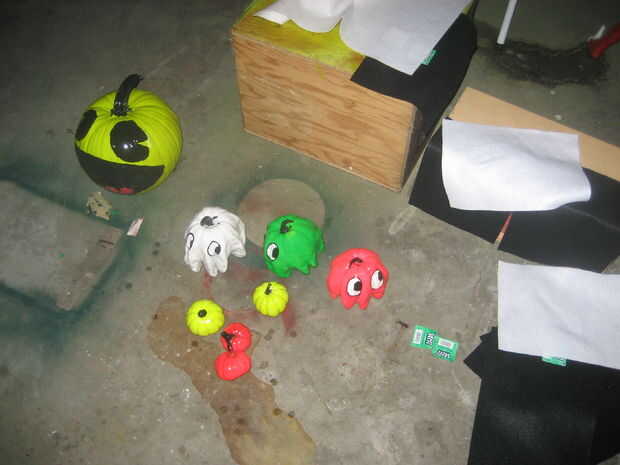 Pac Man, fantasmas, pellets y cerezas. El Pac Man y los fantasmas son tallados de calabazas de torta de azúcar. El Pac Man fue tallado en él lado así que pude mantener que la forma redonda. Los pellets son sólo pequeñas calabaza calabazas dio vuelta