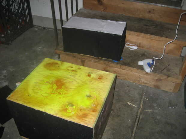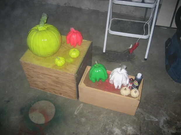 empezaría por la pintura lo más importante primero. Quiere flotar cerca de 6-10 pulgadas lejos del medio como usted para obtener una capa uniforme de pintura. También tenga en cuenta que si pasa el ratón por el mismo lugar recibirá gotas. Después seca (no debe tomar mucho tiempo) utiliza un rotulador para hacer los ojos y boca y cosas. Entonces llené en los detalles con la pintura acrílica adecuada. Deje que se seque más y al final les apagado con una capa de laca. Por las cajas realmente podría usar lo que quieras. Caliente pegar el fieltro a los lados de las cajas y pegado las esquinas con esa cinta azul eléctrica para darle esa sensación de juego de video.