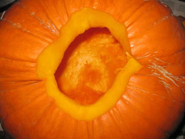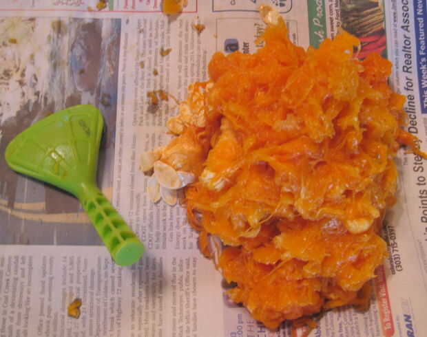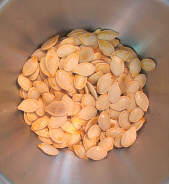 Limpie el interior de la calabaza como haría normalmente al hacer un Jack-o-lantern. Sacar el conjunto de las semillas les aparte en un tazón de fuente por ahora – será importantes en los pasos 6 y 7. Tratar de mantener como poco mugre baboso en las semillas como sea posible. En cambio, por separado excepto la mugre viscoso, filante, puede utilizarse en el compost-o-linterna más tarde, en el paso 10. Por último, si usted raspe cualquier material calabaza más duro hacia fuera, coloque a un lado también va a ser importante para hacer la calabaza hacer un puré, en el paso 8.