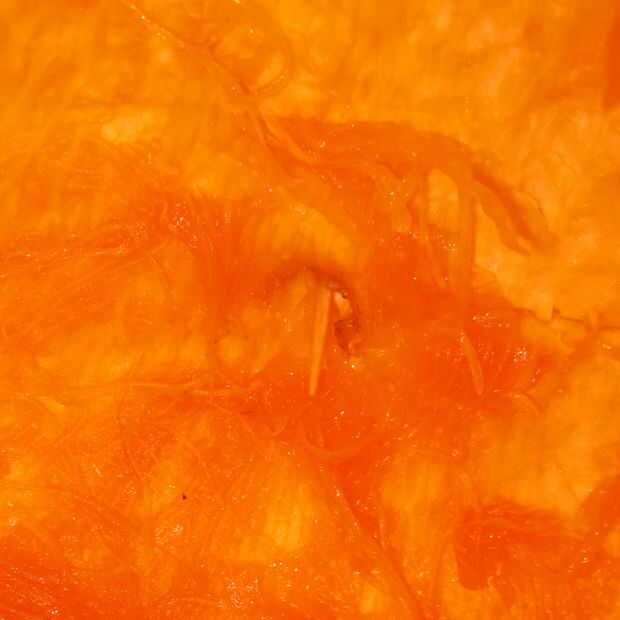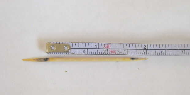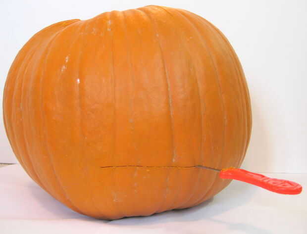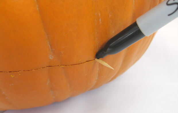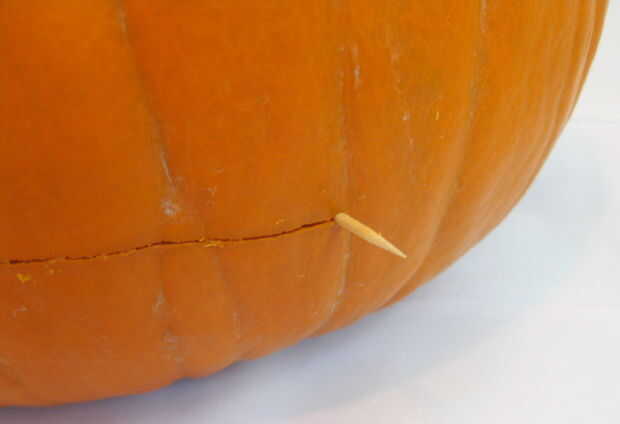 A continuación usted querrá averiguar es cómo densamente de la calabaza. (Esto es para poder hacer la base de la bandeja de servir sólo lo suficientemente gruesa como para deslizar a la rendijas a hacer – si nos fijamos en las imágenes de abajo, esto hará sentido.) Para calcular el espesor de la calabaza, empujar un palillo en el corte que acaba de hacer para que puedan ver el palillo de dientes asomando hacia fuera en el interior de la calabaza. Marque los extremos expuestos del palillo con un marcador permanente. Entonces saque el palillo de dientes y medir la distancia de las marcas.