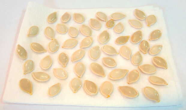 Poner las semillas sobre una toalla de papel doblada (o varias toallas de papel, si guarda un lote de semillas). Extiéndalas en una sola capa y no dejes que toquen. (Si tocan entre sí, podría atascarse entre sí.) Colocar en un lugar fresco y seco por una semana, pero no te olvides de ellos, después de que han estado allí un día o dos, moverse las semillas un poco para que no se atascan a la toalla de papel.