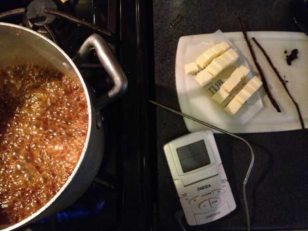 Preparar la mantequilla cortando en trozos pequeños. Raspe las semillas de la vaina de vainilla y dejar de lado. Al llegar a 240 grados F, apagar el fuego y agregue las semillas de frijoles de vainilla y mantequilla.