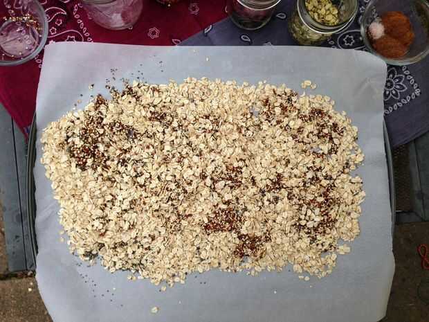 7 tazasIngredientes2 tazas rebanadas de almendras2 tazas de avena tradicional2 tazas de semillas de calabaza crudas1/2 taza de almendras enteras (opcionales - para la diversión)1 cucharadita de tierra canela1 cucharadita de sal1/2 taza dulce con sabo