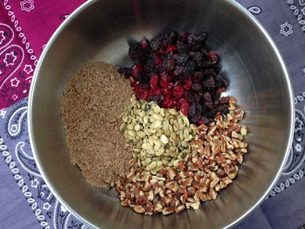 En un recipiente mediano, agregar nueces, pasas, arándanos, semillas de lino y calabaza de la tierra.