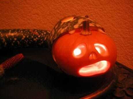 pongo una luz en la calabaza de bebé para proporcionar iluminación y corte un orificio en la parte de atrás donde la boca de la serpiente cubrirlo del té. Proporciona ventilación y permitió a ojos de la serpiente a brillar.