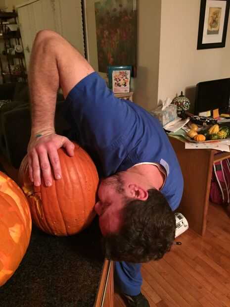 Este paso es opcional, pero hace que para una buena foto! ¿No estoy seguro lo que mi esposo está haciendo a esa calabaza? No te preocupes - sólo sopla lejos el valor interior de la calabaza de los orificios perforados.