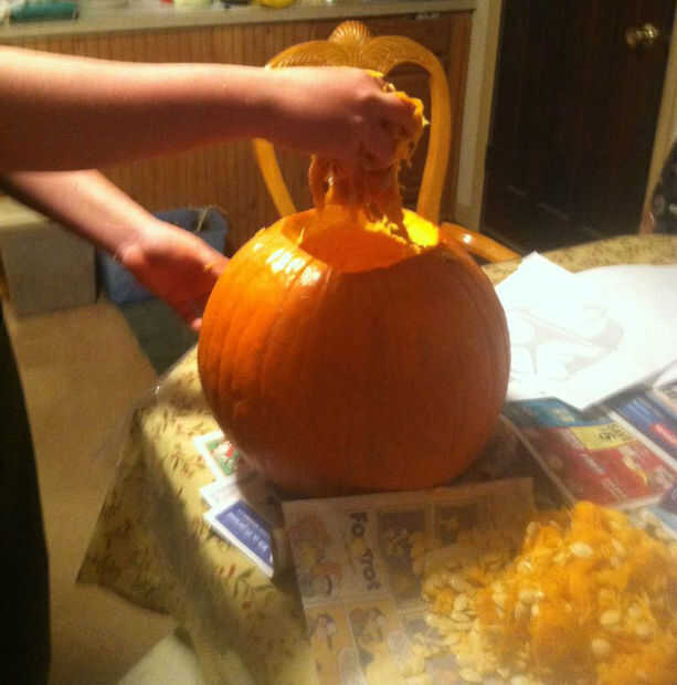 Esta parte fue muy sucia, que tuve que ir y raspar todas las semillas con la herramienta de scrapper/cucharas. Fui por todos los lados dentro de la calabaza y entró la calabaza a través de la totalidad que cortar la parte superior de la calabaza y luego con mis manos agarré las entrañas de la calabaza y se tira de ellas hacia fuera.