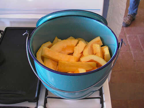 1/2 kilogramo de calabaza1/2 taza de azúcar3 cucharada de harina2 tazas de leche2 cucharada de mantequilla o ghee1 cucharadita de vainilla o rosa estáCoco, nueces, pasas de uvaPaso 1: Corte la calabaza en cubos pequeñosPaso 2: Poner en una cacerolaPa