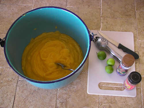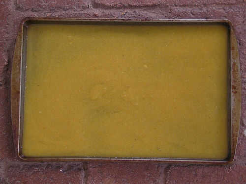 Mezclar todos los ingredientes hasta que quede bien mezclado. Luego Vierta la mezcla en cuatro 10 "x 15" engrasada para galletas. Que desea ser bastante delgada, por lo que se puede ver vagamente el gris de las galletas a través de la calabaza.