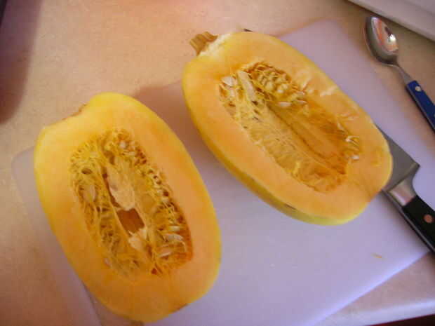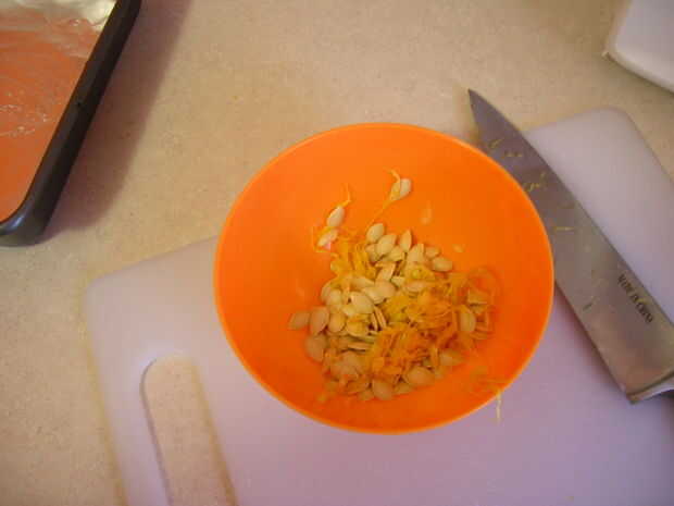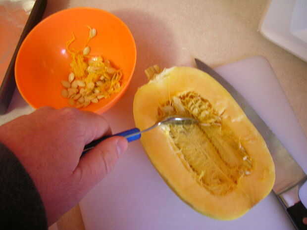 Tomar una cuchara y limpiar las semillas. Puede establecer estas a un lado para asar como semillas de calabaza más adelante si lo desea.