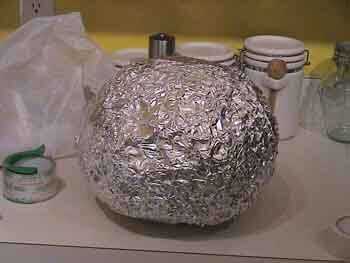 Lo primero que hice para mi calabaza fue hacer una base para poner papel machie. Lo hice un montón de bolsas de plástico de supermercado y pegándolas dentro de uno al otro hasta que me dieron una forma calabaza aproximada y el tamaño. Entonces grabó algunas toallas de papel sobre esto para conseguir una mejor forma. Luego cubrí la base con papel de aluminio. He encontrado este machie del papel no se pega al papel de aluminio muy bien, por lo que esta capa hará fácil quitar el papel machie calabaza una vez seco.