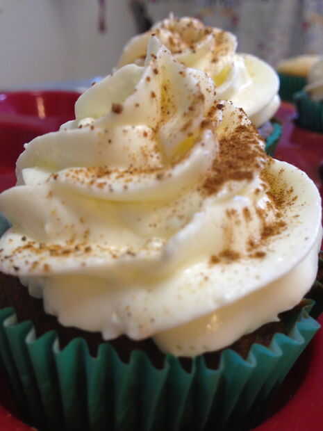 Cuando los cupcakes estén fríos, llenar una bolsa de decorar con el glaseado y tubo en los cupcakes! (O sólo lo palmada en con una espátula offset) Rematar con algo de canela y nuez moscada y disfruta!