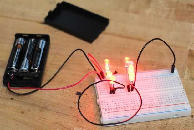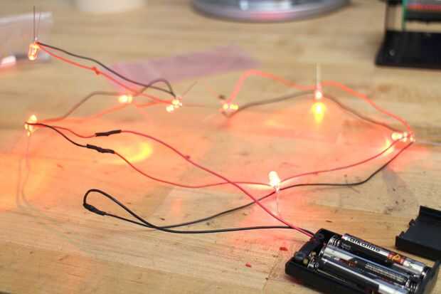 Los LEDs fueron probados primero en un protoboard y luego soldados a una batería con un interruptor. Dejé deliberadamente que el LED lleva mucho tiempo para tenerlas a pegar en el interior de la carne de calabaza. Si realmente wan a permanecer fiel al rojizo fantasma de Pac-Man, Blinky, usted puede cambiar hasta los LED regulares para parpadear unos.