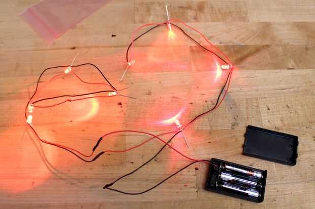 Quería mi calabaza luz hacia arriba desde el interior con luz roja así que hice una matriz de LED muy simple, accionado por 3 baterías AAA alambré hecho 2 arreglos de 4 LEDs en paralelo que luego fueron conectados juntos en serie.