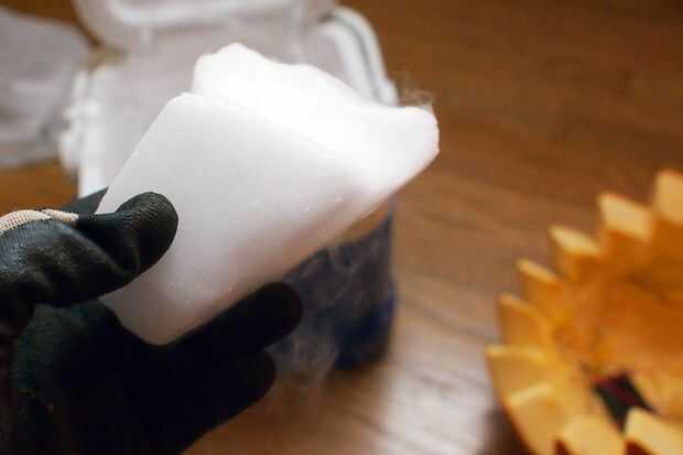Para realmente tomar las cosas al siguiente nivel usé hielo seco dentro de mi calabaza, dándole ese efecto niebla espeluznante. Puesto que el hielo seco sublimes a-78.5 ° C (-109.3 ° F), es importante usar guantes al manipular, de lo contrario puede obtener quemaduras del frío.