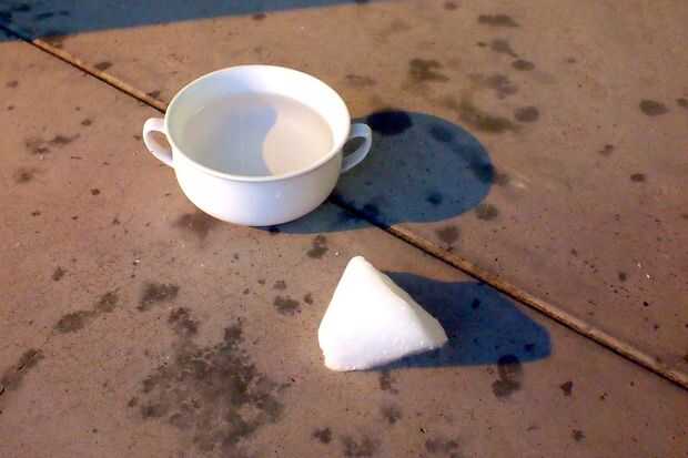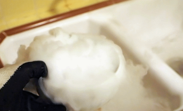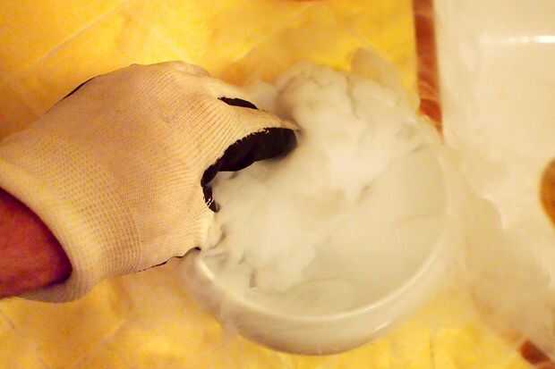He utilizado un martillo para chip cuidadosamente de un trozo de hielo seco un poco grande que una pelota de golf. Añadir hielo seco en agua hará que se caliente y sublimar a un brumoso, agregando para agua caliente se intensificar la reacción y crear un efecto mucho más dramático.