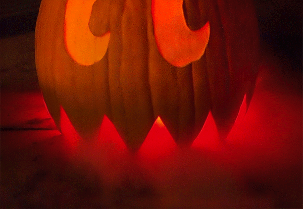 Combinado con el LED rojo, la niebla de hielo seco realmente da a este fantasma calabaza un resplandor misterioso.