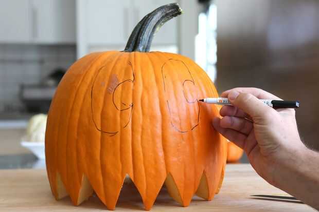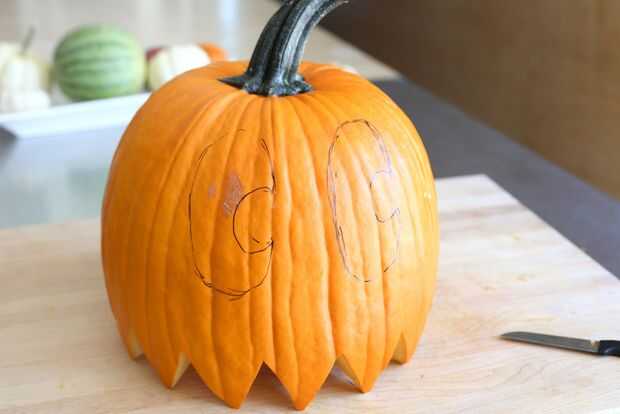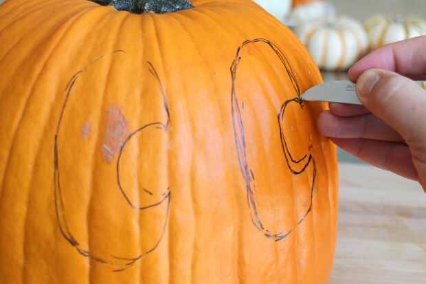 En lugar de cortar los ojos decidieron simplemente raspe la piel superficial de la calabaza. Comencé por delineando los ojos con un cuchillo afilado, cortando justo por debajo de la piel de la calabaza, pero no va todo el camino a través de la carne.