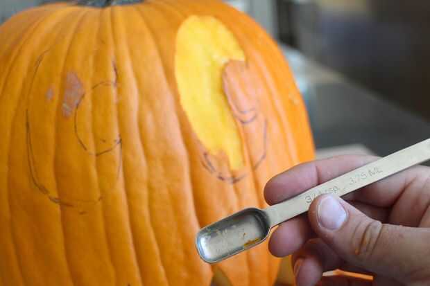 Usé una pequeña cuchara dosificadora para raspe la piel de la calabaza, revelando la carne color más ligera debajo. Cualquier cuchara con un borde afilado puede alcanzar la acción de raspado, así que caza alrededor de la cocina y estoy seguro de que encontrará algo adecuado.
