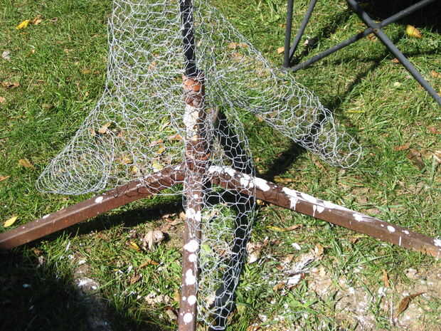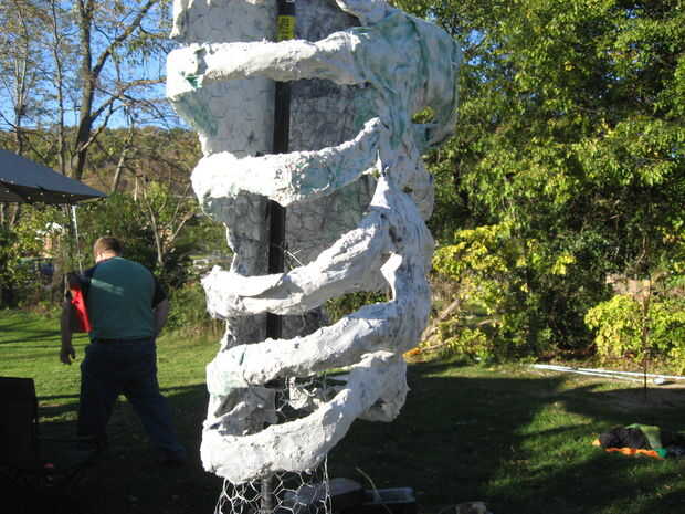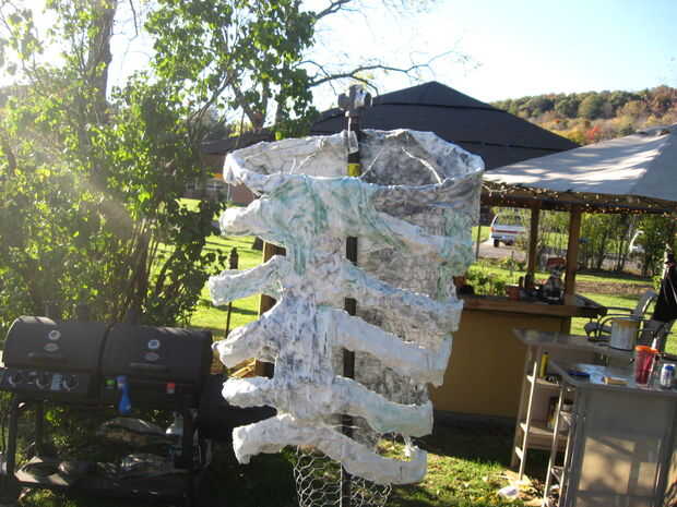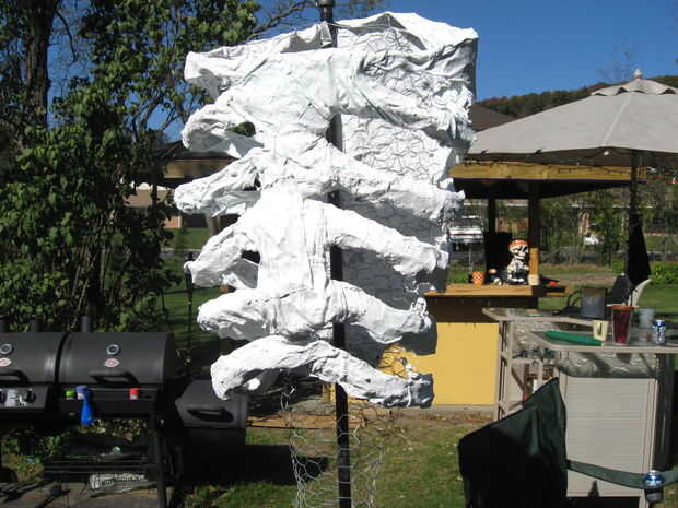 Mientras mi hija trabajaba en la cabeza empecé a hacer lo mismo con la caja torácica. Una vez que la caja torácica se completó luego añadí raíces a la parte inferior del tronco para que se vea más como una vid retorcida de un cuerpo. Usé alambre de pollo más y había formado 3 conos y conectado a la parte inferior del tronco a un ángulo para lograrlo. Luego empecé a aplicar las tiras de yeso al tronco. A partir de las raíces y envolviéndolos alrededor y hacia arriba dándoles un aspecto retorcido. Yo no suavizar estos pero en lugar que envolver con pliegues para dar el tronco eso vid.