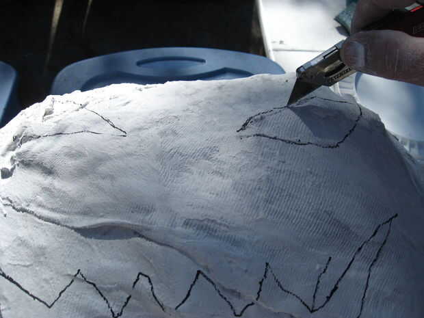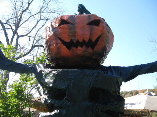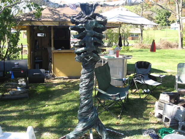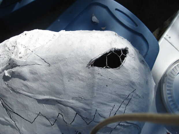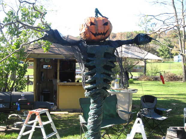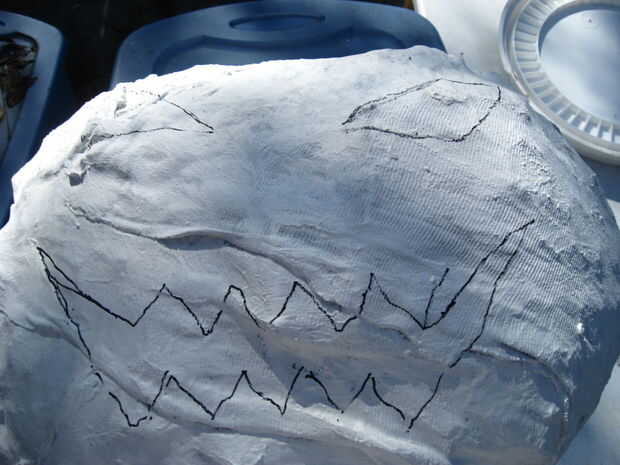 Después era hora de darle a la cabeza de calabaza una cara. Mi hija dibujó una cara de la calabaza y utilizando un cortes de cuchillo y parte de utilidad recorte los ojos y la boca. Luego atamos el 18" trozo de tubo a la punta del conector de cuatro vías y corte un agujero de ½" en la parte superior e inferior de la cabeza de calabaza. Luego se deslizó la cabeza en el 18" pedazo de tubo y pintado naranja con algunos negros para darle dimensión. Decidí entonces que había hecho la caja torácica demasiado bajo así que añadido otra costilla en la parte superior con alambre de pollo y enyesado que se mezclan con el resto del cuerpo. Tomé una pieza de faja de yeso y lo envolvió alrededor de la parte del tubo que sobresale de la parte superior de la cabeza para hacer una vid y había pintada verde y negra. Luego corte dos agujeros de 1" en la parte posterior inferior de la cabeza y encontré 2 luces pequeñas embarcaciones con la calabaza.