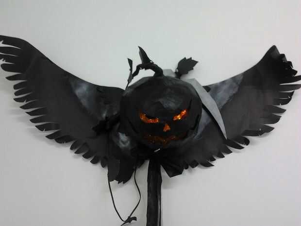 concepto de calabaza hueca lo estaba quemando la calabaza hacia arriba en una horrible criatura que acechan en la noche de Halloween. en una cabeza de calabaza con la punta de su vara en un arma mortal. He creado esta calabaza hueca y tebuat hechos a mano de los materiales usados.