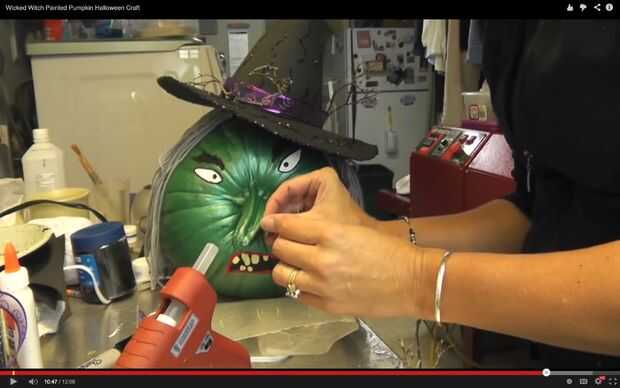 Mientras el pegamento está todavía caliente, poner tres trozos de tanza en el pegamento y sostenga hasta que se enfríe. La línea de pesca va a ser el pelo sobresale la verruga (pegamento caliente) en la nariz de la bruja.
