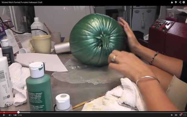 Utilicé una mezcla de verde, metálica verde, metálica blanca y metálica plata. No darle una medida exacta, acabo de poner un montón en mi paleta y se mezclan hasta que conseguí el color que quería. Todo calabazas con esa mezcla de pintura y dejar para secar.