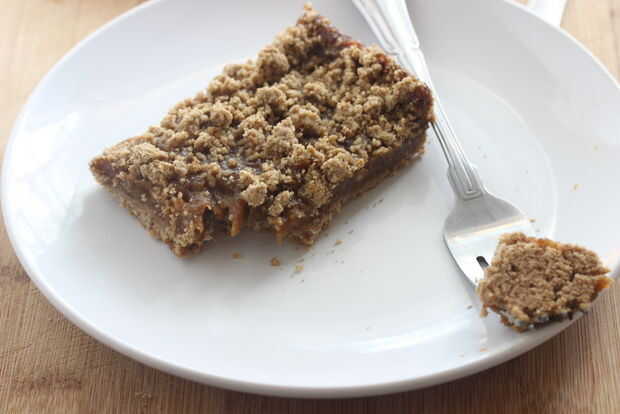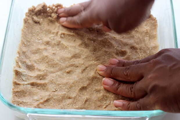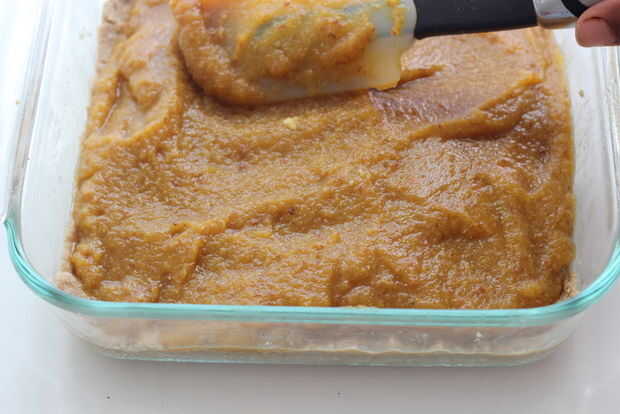 Colocar más de la mitad de la masa en el recipiente cubriendo los lados y coloque en el horno durante 5 minutos. En un recipiente grande Coloque la mantequilla de calabaza, azúcar, canelos y lino semillas; mezclar hasta que ya no hay terrones de azúcar con la mantequilla de calabaza. Desmenuzar el resto de la masa sobre la mantequilla de calabaza y hornear durante 10-20 minutos. Una vez frío cortar en cuadrados y servir con el té helado o menta vainillado.