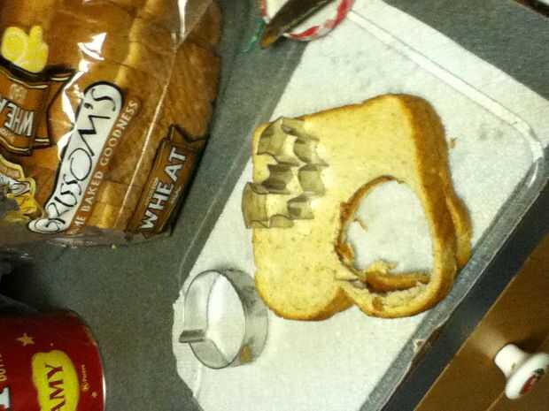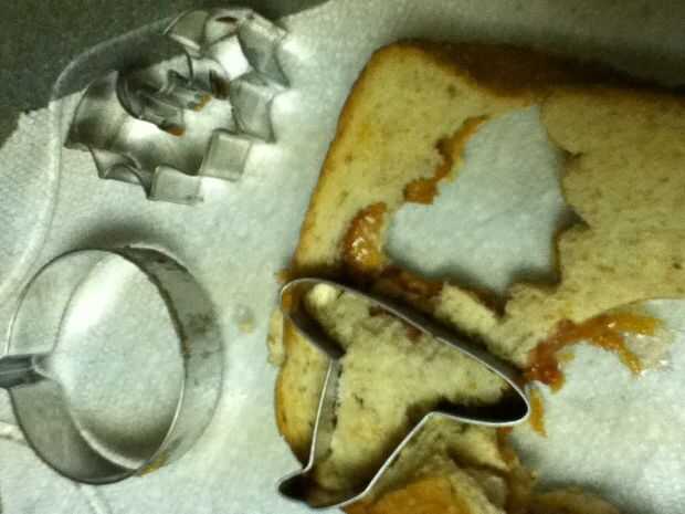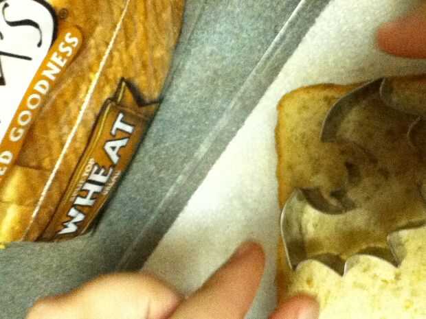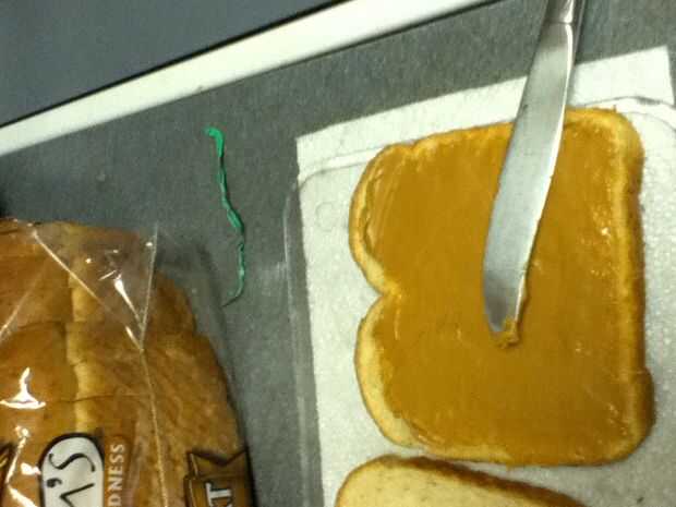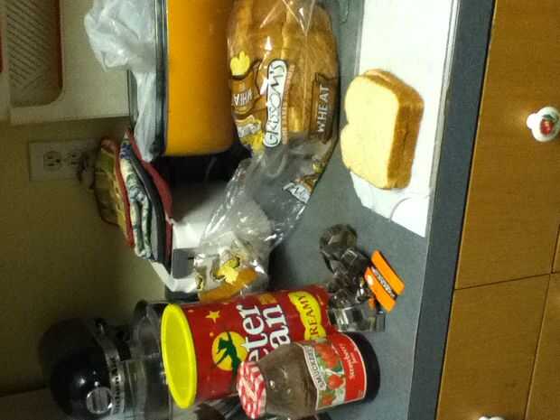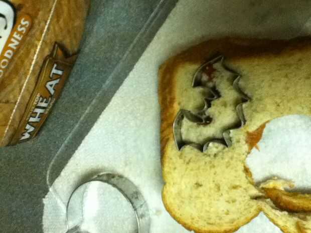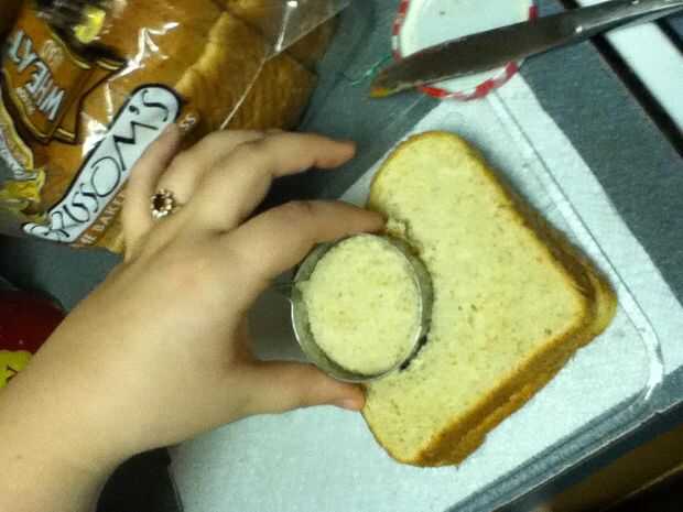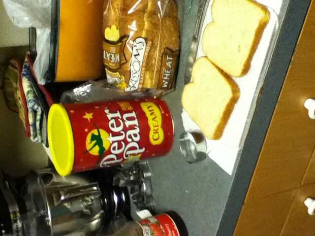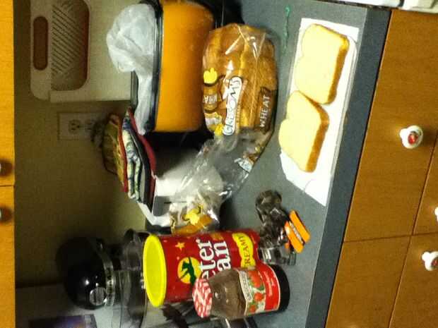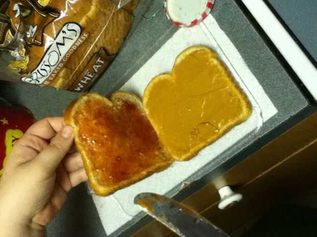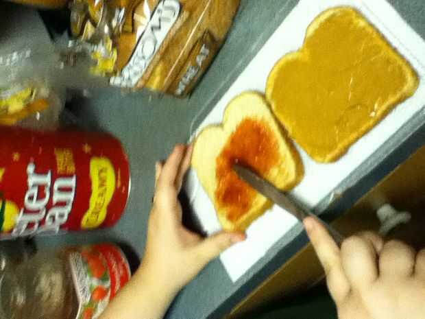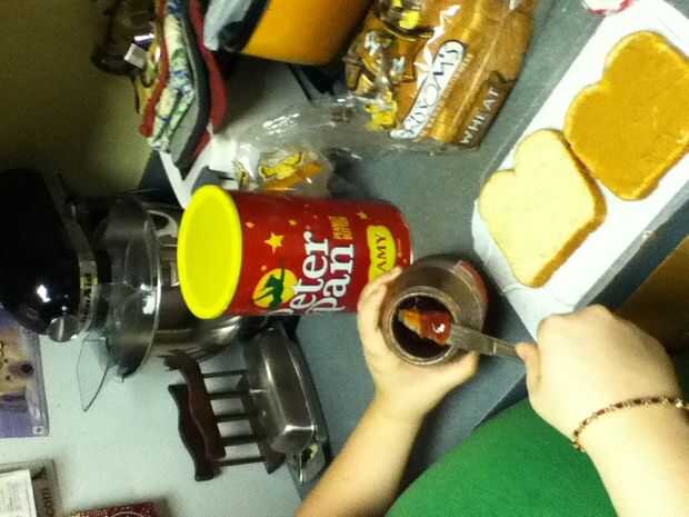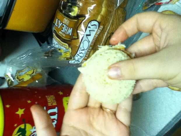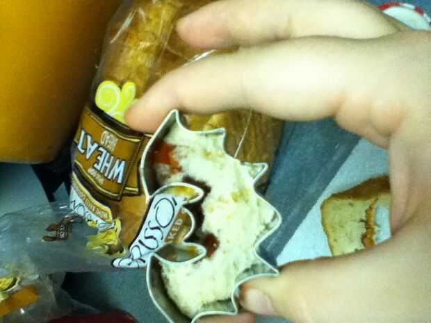 Reuní los bocadillos poniendo mantequilla de maní en un lado del pan y jalea en el otro y entonces me los puse juntos para formar el sándwich entonces tomó la calabaza cortada e hice una calabaza y un palo y un sombrero de Brujas y un ataúd y ponerlos en un plato
