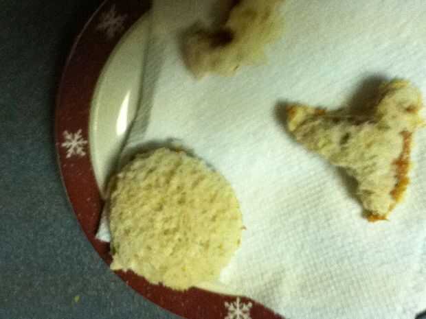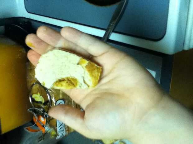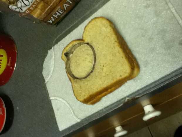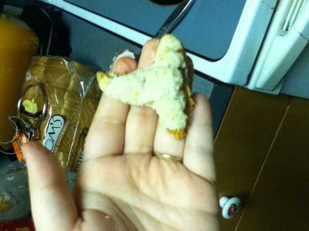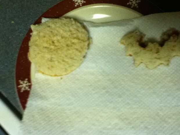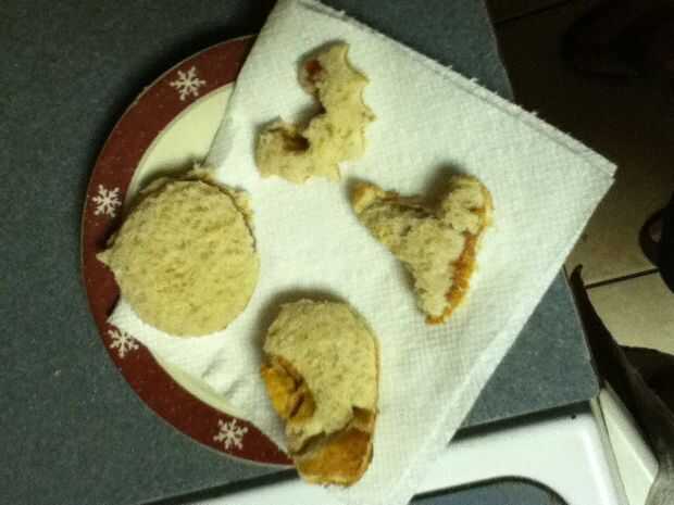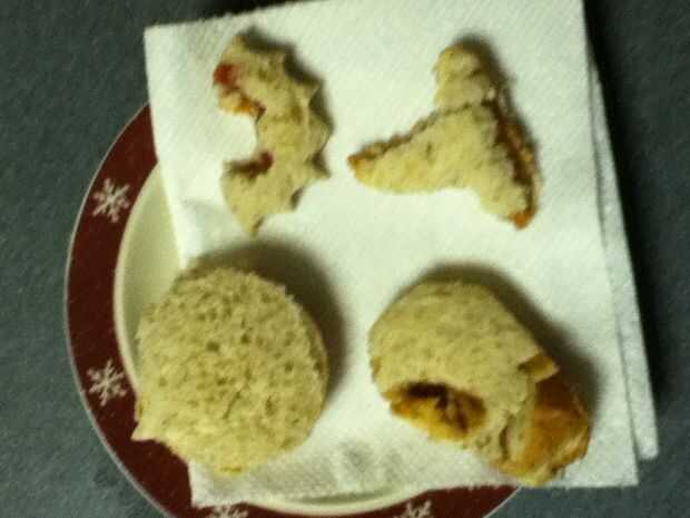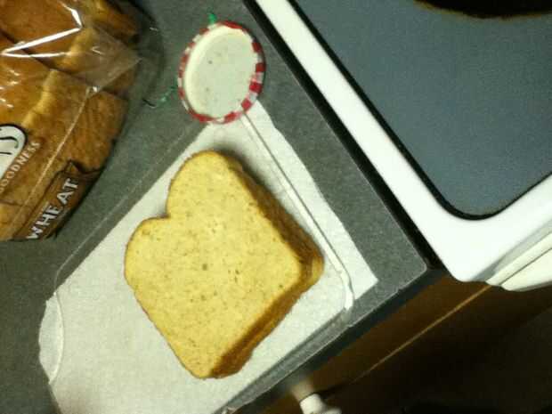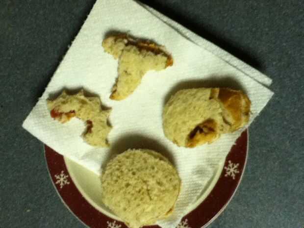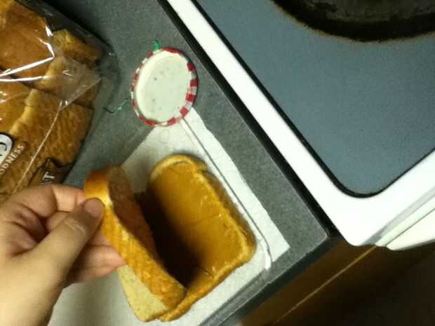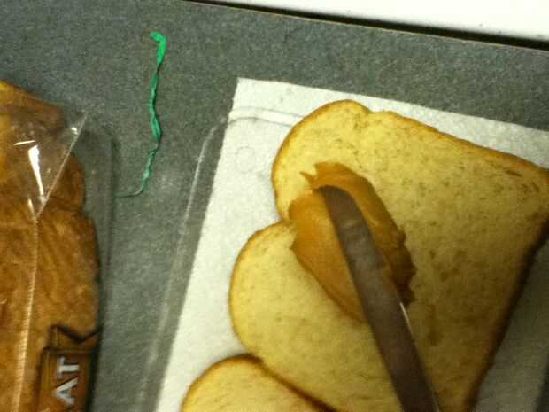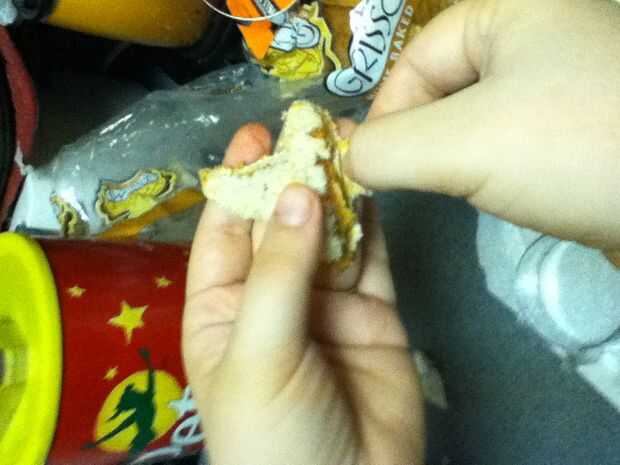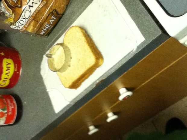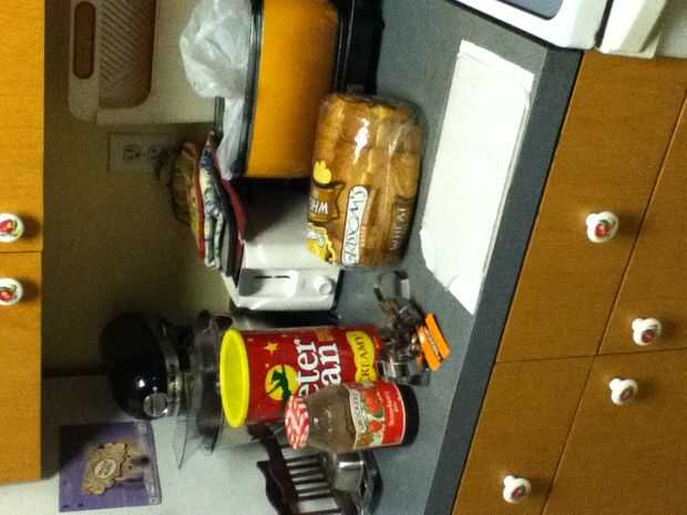 Reuní los bocadillos poniendo mantequilla de maní en un lado del pan y jalea en el otro y entonces me los puse juntos para formar el sándwich entonces tomó la calabaza cortada e hice una calabaza y un palo y un sombrero de Brujas y un ataúd y ponerlos en un plato