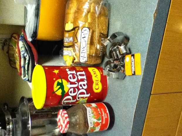Primero reuní todos los ingredientes pan integral, mantequilla de maní y jalea de fresa y por supuesto Halloween Lindo corte outs!