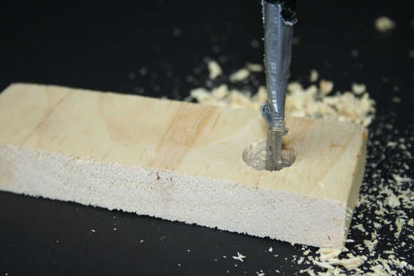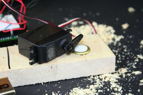 Foto 2 - utilicé un trozo de madera para montar el botón y el servo. Perfore un agujero del tamaño del botón.