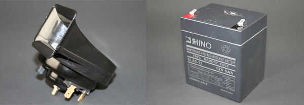 El positivo (+) terminal de la batería se conecta a un terminal del botón. El otro terminal del pulsador se conecta directamente a la bocina. El terminal negativo (-) de la batería se conecta directamente a la bocina. (otra vez, ver esquema, es fácil!) Pulse el botón para una ráfaga de muestra!