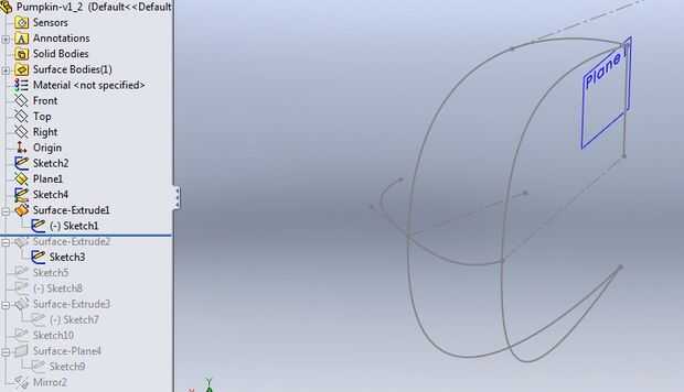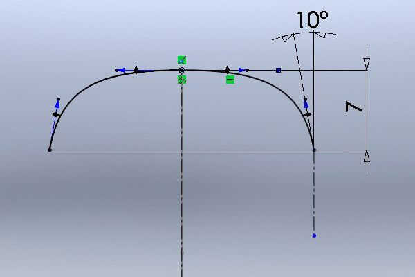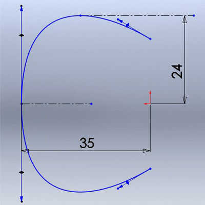 Ahora, crear la sección que define el perfil horizontal de la cáscara de la corteza en el plano superior. Si usted observa una calabaza, verá que es similar a la curva representada en la imagen. También crear esta curva preferentemente con sólo dos puntos de la spline. El punto central debe ser coincidente con el punto medio del primer bosquejo, y el punto externo debe ser coincidente con el plano que acabamos de crear. Entonces, espejo de la curva sobre la línea central.