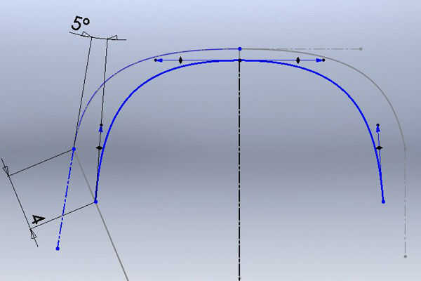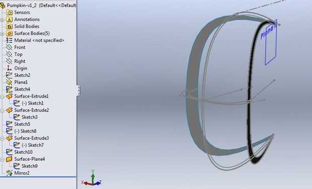 Ahora puede dibujar la curva del perfil exterior de la cáscara de la corteza interna, donde conecta con la cáscara siguiente. Asegúrese de que conecte a las dos curvas anteriores que dibujaras y espejo sobre el plano superior. Luego, crear un dibujo en el ángulo plano y hacer una convertir entidades en ambos el croquis de perfil interno y externo de la costilla. Conecte los extremos con líneas rectas verticales para que tenga un dibujo cerrado. Entonces, crear una superficie plana de este sketch y espejo sobre el plano derecho. Deberás acabar con el modelo mirando como el representado en la imagen.