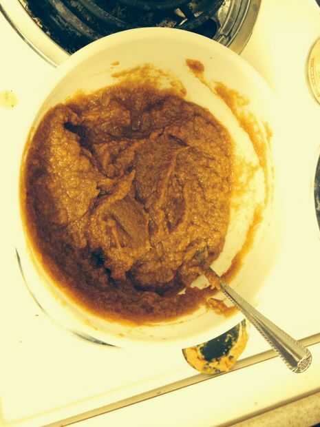 Te sugiero mezclar las especias con el jarabe de arce en primer lugar, para asegurar una distribución uniforme a lo largo de la mezcla. Luego lentamente incorporar la calabaza. Desea un color uniforme en todo.