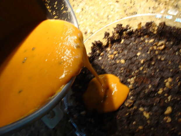 2.) Presione la mezcla en un 9 1/2 pulgada pie pan. Ponga a un lado.
