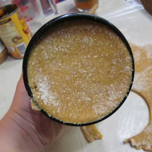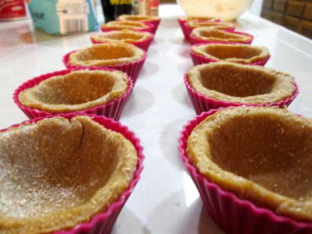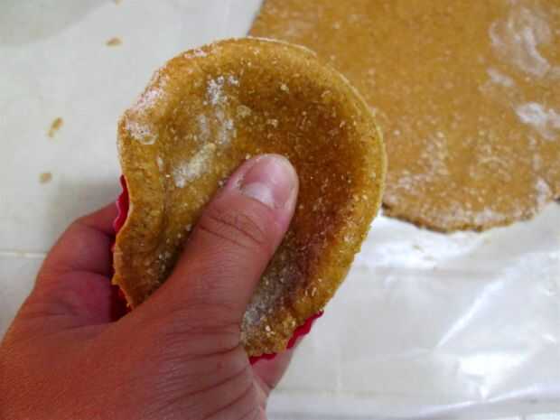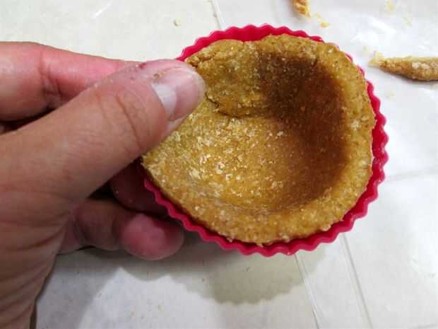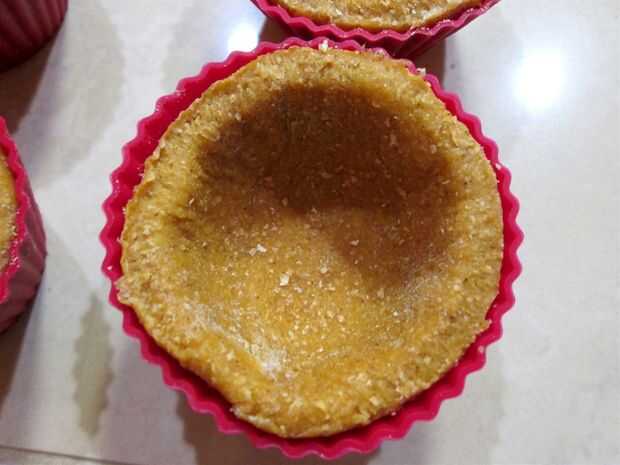 Coloque el círculo de corte corteza en la Copa de silicona y presione en la Copa. He intentado que mi mejor hacer incluso por los lados de la taza para hornear, como lo haría para una tarta normal.