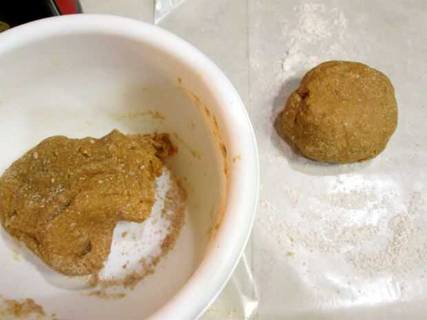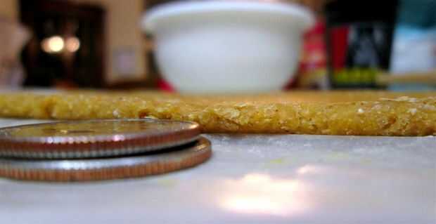 Usar su balanceo perno y en un espacio de trabajo cubierto de harina (yo uso papel encerado debajo para limpiar fácil), rodillo la masa plana en un espesor de unos dos cuartos americanos apilados uno encima del otro.