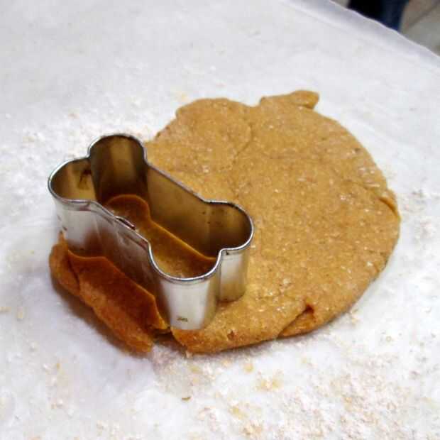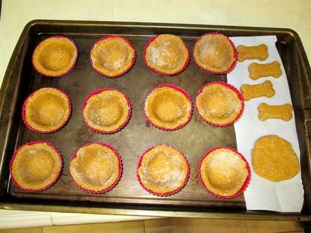 Usé mis cortadores de la galleta de perro hueso para cortar formas en el resto de la masa. Nota: Estos tendrán que hornear más de las copas.