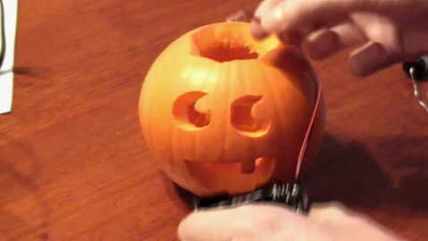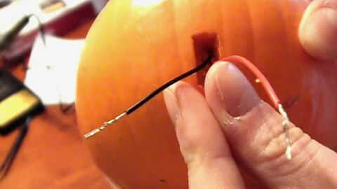 a continuación, inserte el módulo LED en la calabaza y no se olvide de sacar los dos cables a través de la ranura trasera.