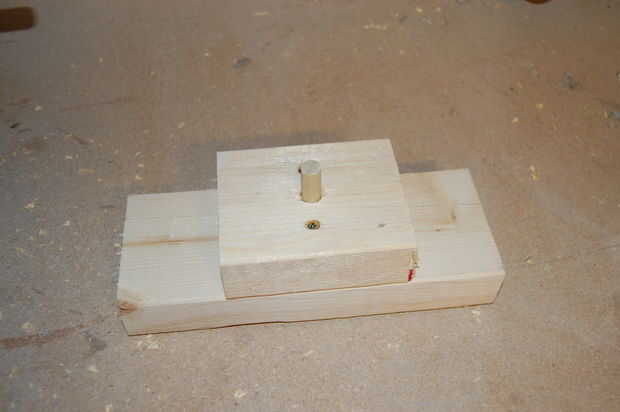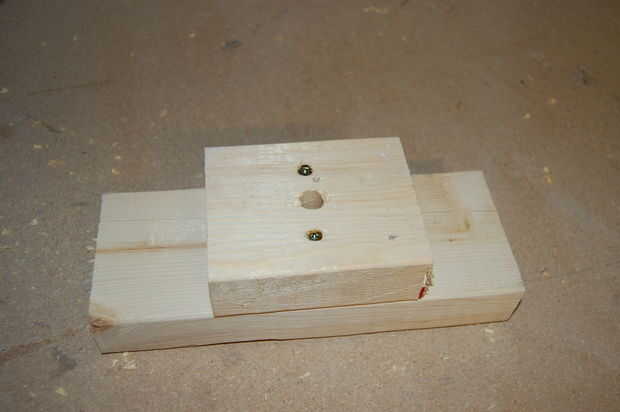 La plantilla es simple un agujero perforado en una pila de pedazos de desecho 2 x 4. Apilar un trozo pequeño encima de uno más largo y había sujetado con tornillos. Luego perforé un orificio de 1/2" en el centro con un taladro. El diámetro del agujero debe ser sólo ligeramente más grande que el diámetro de los mangos que utilizas. La profundidad del orificio debe ser aproximadamente 1/4"-1/2" de menor que la longitud de la manija (en mi caso, 1.5" de profundo)