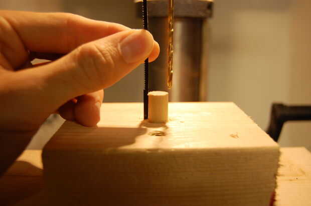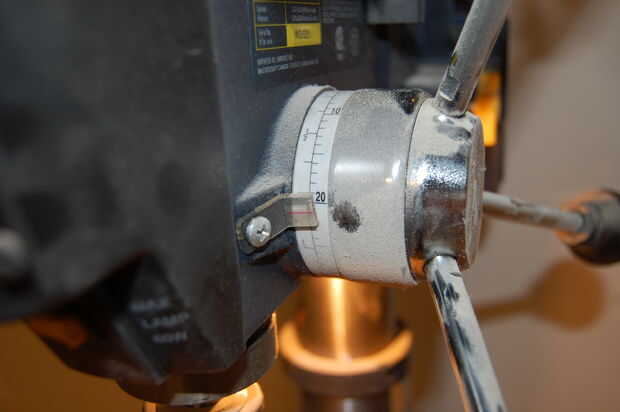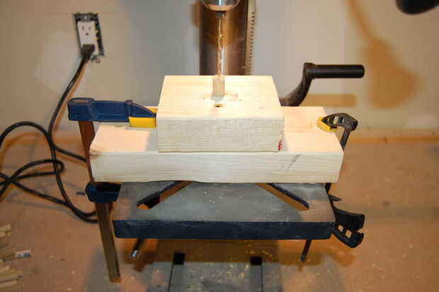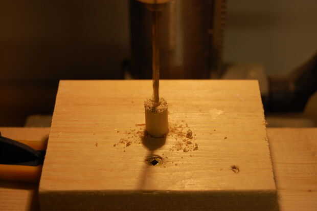 Sujete su plantilla para la mesa del taladro, de modo que el agujero quede centrado exactamente debajo de la broca. Establece el tope de profundidad para que el agujero es igual a la longitud del extremo de la hoja (aproximadamente 1/2").