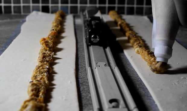 Tomar la mezcla en la Manga pastelera y tubo de relleno hacia abajo toda la longitud de ambas tiras de hojaldre