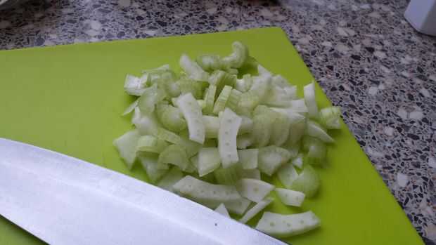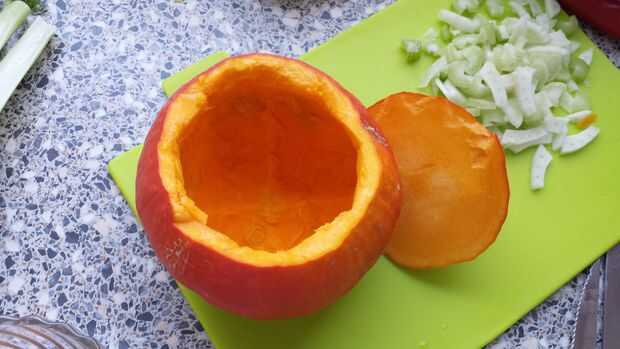 Una buena comida empieza con algunos para picar! Picar el hinojo y el pimiento rojo. A continuación el corte de la parte superior de la calabaza y sacar la calabaza. Quitar las semillas de la calabaza. Mientras tanto, calentar el caldo!