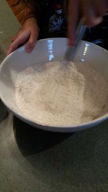 Luego volcar su primer tazón de fuente de mezcla del polvo en su segundo tazón y batirlo todo junto.
