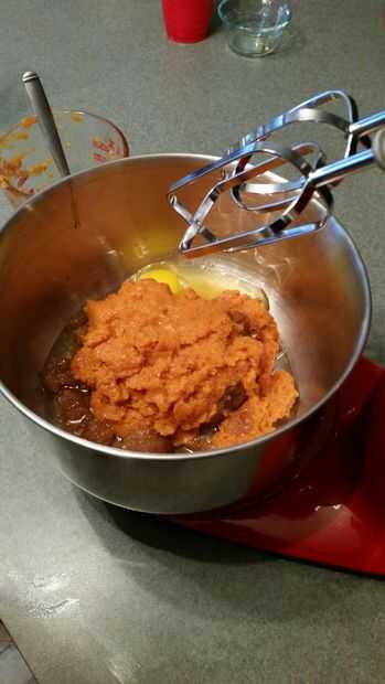 En un recipiente aparte mezclar el aceite vegetal, calabaza, huevos y vainilla. Como en la imagen 3.