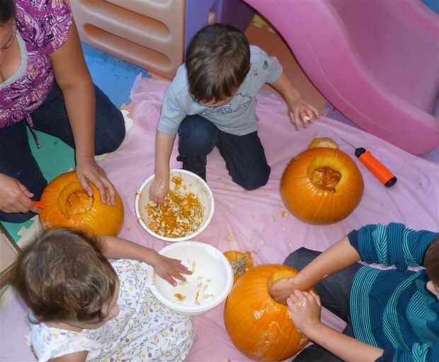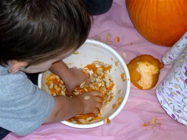 Tallada a nuestras calabazas unos días antes de Halloween, así que mantuve las tripas de calabaza en un recipiente de plástico durante la noche para hacer trata al día siguiente.